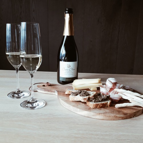 Glas Champagner Cuvée Clara – hausgemachte Tapenade – möblierte Terrasse – Feuerstelle und Decken